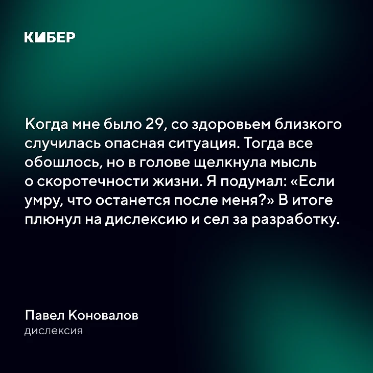 «Когда мне было 29, со здоровьем близкого случилась опасная ситуация. Тогда все обошлось, но в голове щелкнула мысль о скоротечности жизни. Я подумал: «Если умру, что останется после меня?» В итоге плюнул на дислексию и сел за разработку».