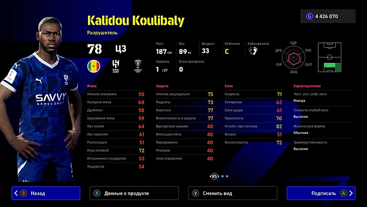 Калиду Кулибали – могучий стартовый центрдеф. Сенегалец уже третий год играет в Саудовской Аравии, но не растерял прекрасных оборонительных характеристик и крепчайший корпус. Кулибали знакомы основные защитные умения, а навык «Способности капитана» заметно повышает выносливость всей команды.