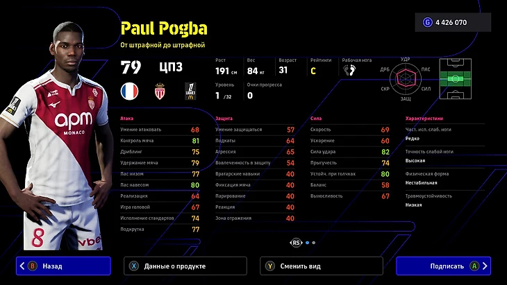 Француз вернулся в большой футбол после длительной дисквалификации. Поль сразу получил прежние характеристики с шикарными дальними забросами и четырьмя навыками пасов. А еще он неплохо цепляется за верховые мячи – важное умение для центра поля. Погба ужасно защищается, поэтому ему нужен партнер-опорник.