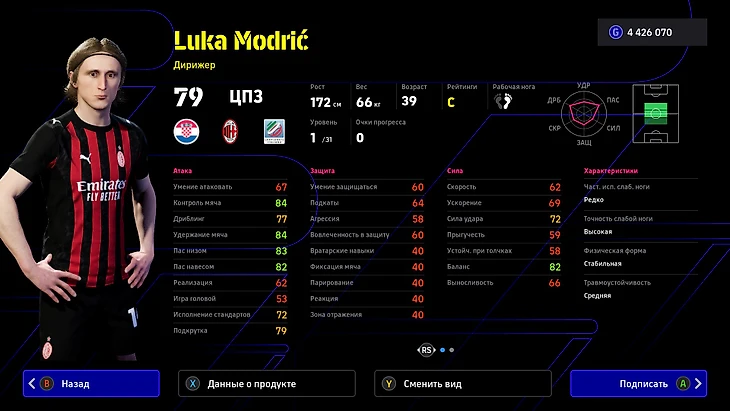 Идеальный товарищ Погба в полузащите – Лука Модрич. Именитый хавбек закончил главу в мадридском «Реале» и притащил в Италию невероятные характеристики. Способности хорвата в розыгрыше мяча добираются до 90 баллов, но мы советуем распределить часть очков на скорость. Он прекрасен в строительстве атак и удержании мяча, а вот в защите он точно не помощник.