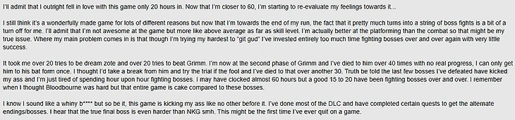 При этом часть критики направлена не столько на сложность, сколько на реализацию механик. Некоторые боссы и испытания кажутся просто нечестными или плохо продуманными.
