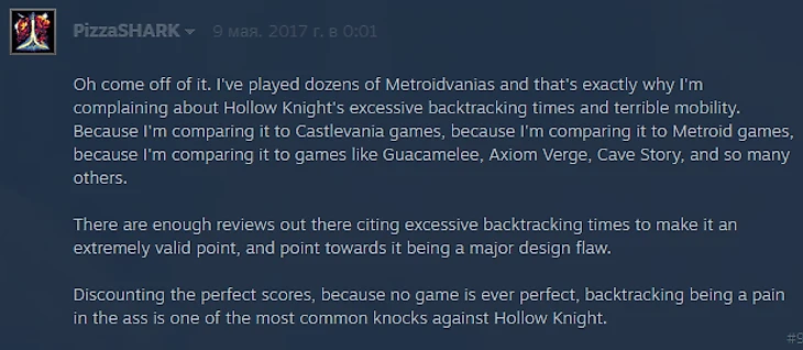 💬 «Да ладно вам, я прошел десятки метроидваний, и именно поэтому жалуюсь на чрезмерный бэктрекинг в Hollow Knight и отвратительную подвижность. Потому что я сравниваю ее с играми Castlevania, потому что я сравниваю ее с Metroid, потому что я сравниваю ее с такими играми, как Guacamelee, Axiom Verge, Cave Story и многими другими <...> Если отбросить идеальные оценки (ведь ни одна игра не бывает совершенной), то именно скучный бэктрекинг чаще всего называют одной из главных претензий к Hollow Knight».