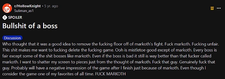 💬 «Кто вообще додумался убрать чертов пол из боя с Маркотом? К черту Маркота. Это гребаное дерьмо нечестное. Из-за него так и хочется удалить игру к чертям. Да, игра прекрасна, но только не с Маркотом. Все боссы честные, кроме таких дерьмовых, как Маркот. Даже если босс неудачный, он все равно в сто раз лучше этого урода по имени Маркот. Мне хочется разнести экран в щепки только от одной мысли о нем. К черту этого типа. Честно, к черту его. Наверное, у меня останется плохое впечатление об игре только из-за Маркота, хотя я считаю ее одной из лучших игр всех времен. К ЧЕРТУ МАРКОТА».