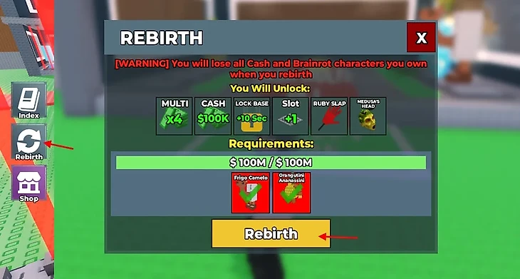 Вне зависимости от уровня, когда вы подготовите все свое добро, кликните по кнопке Rebirth слева на экране. Убедитесь, что у вас всего хватает, и нажмите еще раз кнопку Rebirth. Готово – теперь вы поднялись по лестнице уровней, но начинать будете свой путь в Steal a Brainrot с чистого листа.