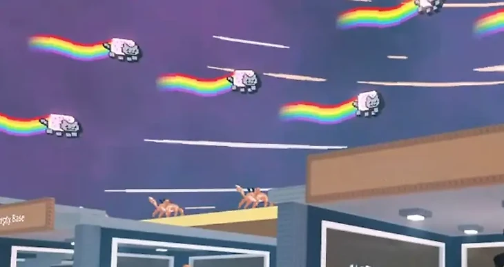 Карта погружается в темноту, а в небе появляются знаменитые мультяшные кошки. Периодически одна из кошек сталкивается с брейнротом, передавая ему соответствующую черту. Такой брейнрот оставляет яркий радужный след и отмечается фирменным логотипом Нян Кота.