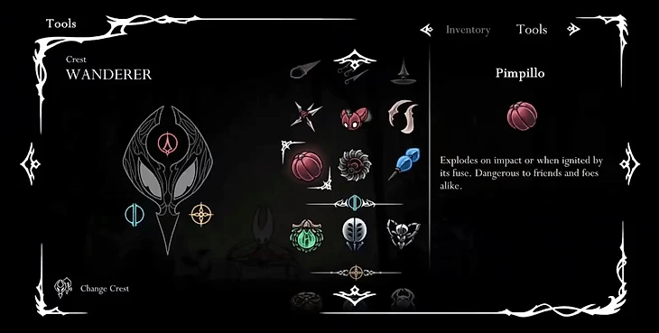 Амулеты из Hollow Knight заменены системой знаков. Знак – это основа сборки, он определяет набор ячеек для инструментов и иногда меняет стиль ударов Хорнет. В ячейки вставляются инструменты: красные отвечают за атаку и со временем ломаются, синие и желтые дают пассивные бонусы вроде защиты от лавы или увеличения здоровья. Больше свободы и экспериментов.