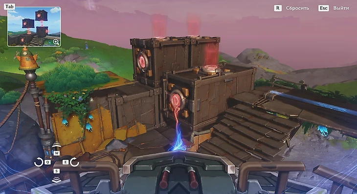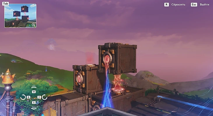 1. Садитесь в Бобика и решите первую головоломку с контейнерами. Нужно правильно поднимать и вращать ящики, чтобы они заняли свои места. Первая задача простая: поставьте большой ящик вертикально (E и Q для вращения), а маленький – слева от него.