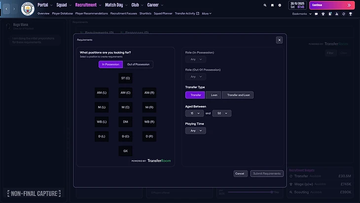 ● Команда FM продолжила партнерство с TransferRoom и перенесла фичи цифровой платформы в менеджер. В новой части появятся детальные требования к желаемым футболистам (включая роли), а еще вы увидите интересы других клубов и сможете быстрее продать игрока. Скауты теперь дают подсказки на совместимость кандидатов с актуальными (атакующей и оборонительной) схемами команды.