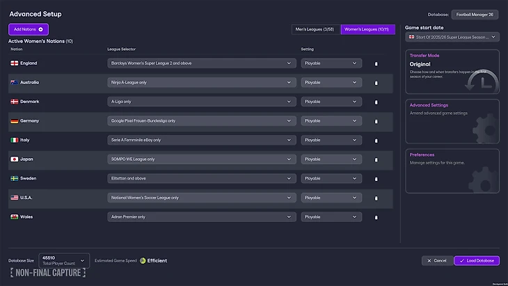 ● Впервые в FM появится женский клубный футбол. Всего 14 лиг из 11 стран: английские Суперлига (WSL) и Суперлига 2, американская NWSL, немецкая Фрауэн-Бундеслига, японская WE League, итальянская Серия А, шведские Дамаллсвенскан и Элитэттан, датская А-Лига, австралийская А-Лига, валлийская Адран Премьер, Лига чемпионов и парочка других. Чемпионаты можно добавить в обычную карьеру и переходить между мужскими и женскими командами.