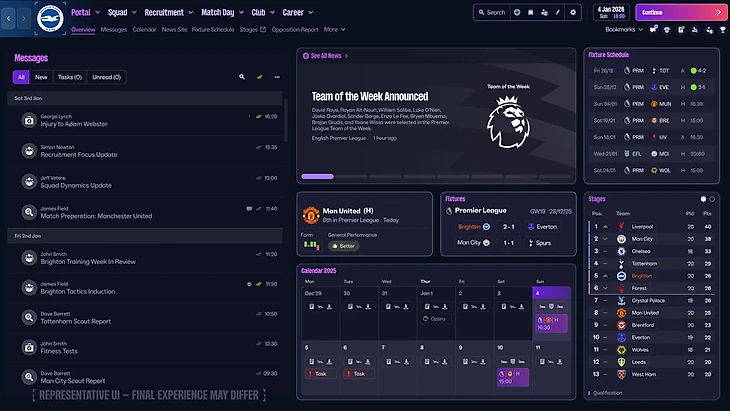 ● В игре заметно поменяли интерфейс. Основная панель навигации переместилась наверх, а плитки стали компактнее и информативнее. Ключевые точки интереса (входящие сообщения, турнирная таблица, календарь и т.д.) объединила титульная страница портала, а шесть индивидуальных закладок помогают быстро перейти в нужные разделы. Появился глоссарий с деталями менеджера – FMPedia.