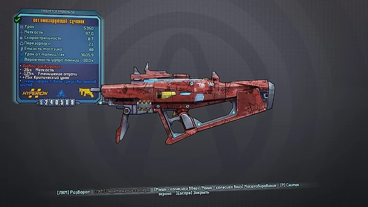 Сучонок – легендарный пистолет-пулемет Hyperion, выпадающий чаще всего из босса 6НК-3Р в локации Бункер. Его главная особенность – бонус к критическому урону и моментальная максимальная точность в режиме прицеливания. Благодаря этому оружие считается одним из лучших SMG в игре.