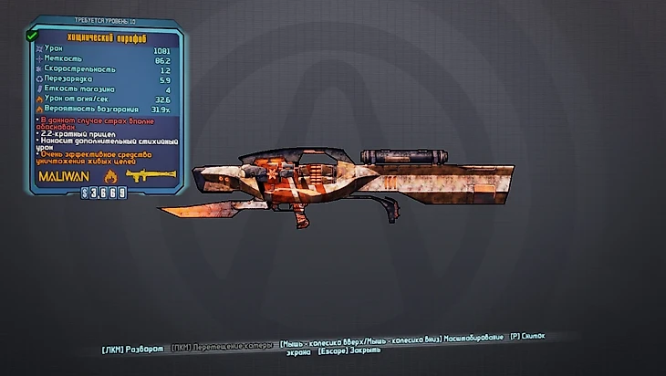 Этот ПП имеет гораздо лучшие характеристики, чем большинство аналогичных моделей, и быстро достигает пика эффективности. При стрельбе от бедра точность постепенно растет, но при прицеливании она сразу становится идеальной. Сучонок особенно полезен для персонажей, полагающихся на критические попадания. Красный текст оружия является отсылкой к песне Элтона Джона «The Bitch is Back», а русская локализация связана с популярным интернет-мемом. Его высокое качество делает его фаворитом среди игроков, предпочитающих скорострельное и точное оружие.