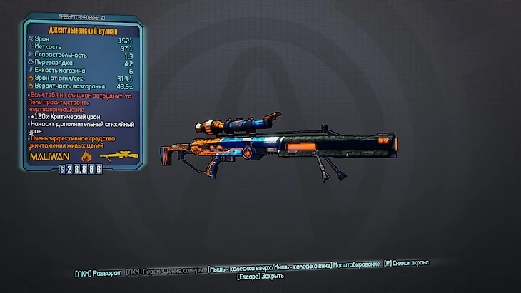 Вулкан – легендарная снайперская винтовка от Maliwan, встречающаяся в Borderlands 2. Она всегда наносит урон огненной стихией и отличается повышенным уроном по площади, но имеет пониженный базовый урон. Наибольший шанс её выпадения – из Воина в Хранилище Воина или Красавчика Волшебника в дополнении «Крошка Тина штурмует Обитель дракона».