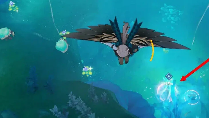Спуститесь к берегу, где видно, что в проливе что-то лежит на дне. Ныряйте в воду и идите вглубь. На дне, в небольшой впадине, вы увидите каменную фигуру, закрытую магическим барьером.