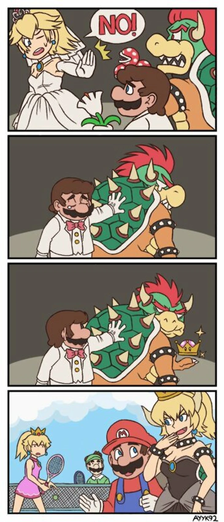 59. Боузетта. Однако самым популярным мемом, связанным с Марио, неожиданно стала Боузетта – женская версия Боузера. 19 сентября 2018 года художник @ayyk92 опубликовал комикс, где Принцесса Пич отвергает Марио, а Боузер использует Супер-Корону и превращается в Боузетту. Пост набрал 66 тысяч ретвитов, после чего волну фан-арта, косплея и мемов уже невозможно было остановить.