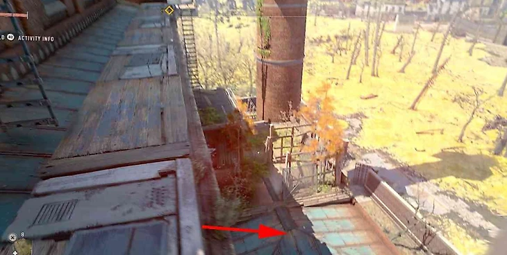 Оказавшись наверху, смещайтесь немного вправо и перепрыгивайте на нижний уровень кровли.