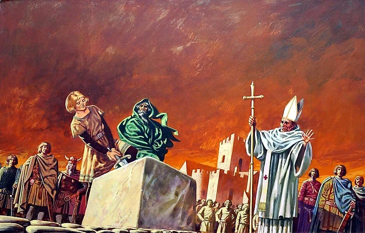 Меч в камне известен под названием Кларент. В Лондоне волшебник Мерлин и епископ Кентерберийский показали рыцарям некий меч – в легенде он лежал на каменной плите, способной плавать по воде, и был вдобавок придавлен наковальней (потом в литературе он уже был воткнут в камень). На камне была надпись – кто вытащит этот меч, тот станет королем всех земель. Не смог этого сделать никто, кроме юного Артура – тогда он не знал правду о своем происхождении, ибо воспитывался рыцарем сэром Эктором. Когда Артур вытащил меч, Мерлин открыл юноше правду – парень был сыном короля Утера Пендрагона, но был с младенчества отдан на воспитание Эктору. Вскоре Артур стал единовластным правителем Британии, отбившись от соседей.