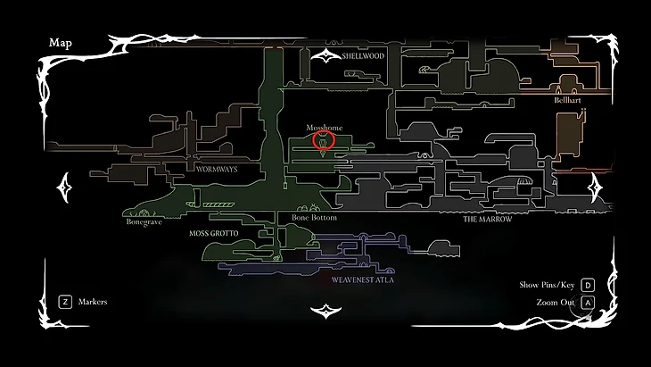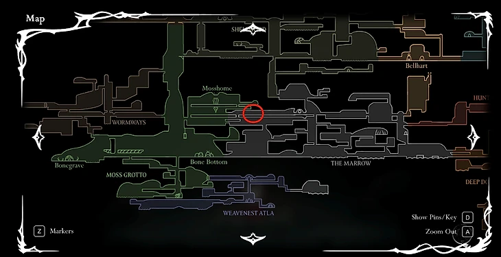Прежде чем разрабатывать стратегию, нужно знать, где найти босса. Колокольный Зверь скрывается в верхней части региона Костяк (The Marrow) – это территория, расположенная справа от Мшистого Грота и города Костяная Низина. Чтобы добраться до арены, двигайтесь вверх и влево через Костяк, пока не встретите картографа Шакру. После открытия прохода, ведущего обратно в Костяк, направляйтесь вправо. Там вы окажетесь на просторной площадке, усыпанной старыми колоколами.