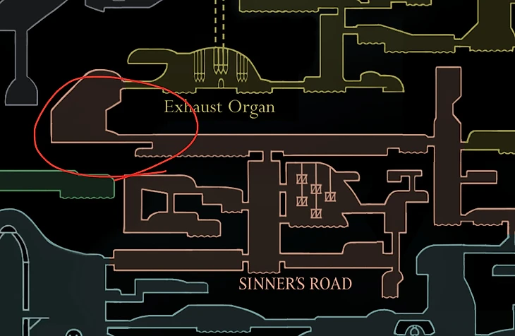 Дальнейший маршрут ведет к массивной конструкции под названием Выпускной орган. Это центральная точка Мглы, где можно немного перевести дух. Внутри игрок находит первую за все время скамейку, а также дополнительные пути, ведущие к бонусам. Среди наград – потерянные блохи, которых можно спасти, и различные предметы, нужные для прохождения.