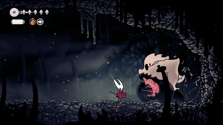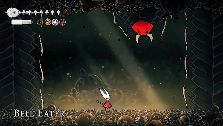 Колокольный зверь впервые встречается в костяных тоннелях Фарлума и предстает как босс, связанный с системой перемещения по миру. Сначала он окутан паутиной, но после освобождения нападает на Хорнет. Его приемы включают стремительные рывки, прыжки через арену и броски тяжелых колоколов, которые отскакивают и создают хаос. Во второй фазе сверху начинают падать дополнительные объекты, усложняя бой. Победив Зверя, игрок получает доступ к быстрому путешествию между станциями, что делает это сражение обязательным этапом прохождения. Этот уникальный противник показывает, что боссы Hollow Knight Silksong могут быть не только преградой, но и союзником.
