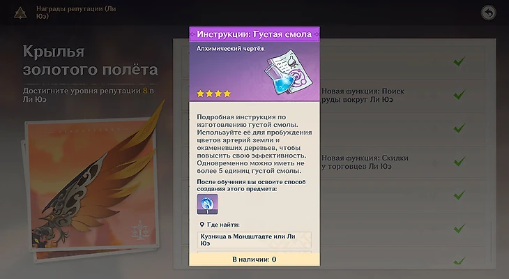 Чтобы получить смолу, также можно скрафтить первородную в густую на алхимическом верстаке. Получите третий уровень репутации в Ли Юэ, чтобы получить рецепт для создания густой смолы.