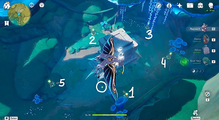 Понадобится лучник (для удобства), но можно и другого персонажа. Возьмите дендрограну, отмеченную кружочком, и по очереди зажгите тотемы. Если сложно переключаться между гайдом и игрой, можете использовать лайфхак – смотрите на значки под тотемами. Тот, который нужно зажечь следующим, подсвечивается, в то время как остальные остаются серыми.
