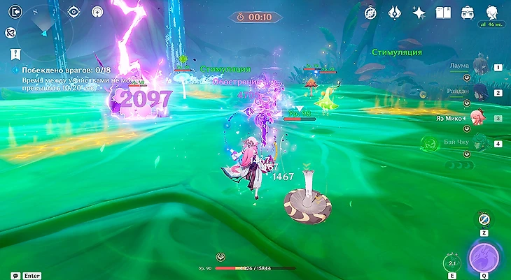 Предпочтение стоит отдать командам на Стимуляции – то есть с элементами Дендро и Электро. Но можно взять и ваш обычный отряд, которым вы побеждаете. Также можно добавить стяжку Кадзухи, Венти, Сахарозы – плесенников много, гораздо проще будет убивать их вместе, а не по одному.