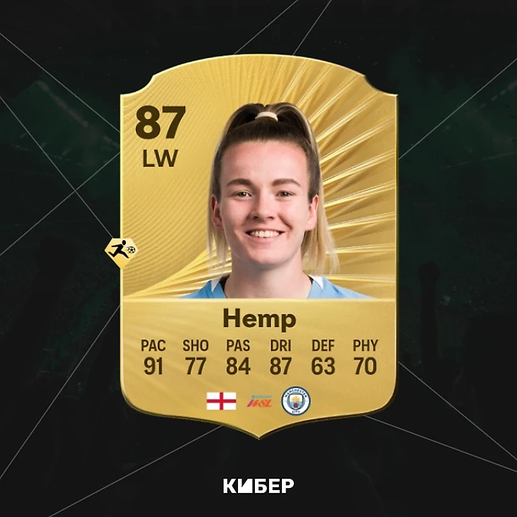Перейдем к нападающим. Очевидный вариант слева – новая карточка Лорен Хемп. Вингер «Ман Сити» мгновенно улетает в атаку (91), отлично простреливает (92) и уверенно нанизывает соперников на дриблинге (87). Ее фланговые проходы дополняют игровые стили «Резвость+» и «Скороход».