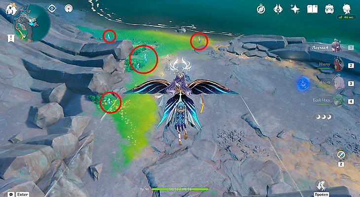 Перед началом фарма возьмите в отряд бесплатную Айно – она отмечает диковинки на мини-карте. Такими же способностями обладают Лаума и Флинс. Соберите один инеевый цветок, зайдите в инвентарь и нажмите на него. В описании справа выберите «Области сбора» для облегчения фарма. Не забудьте съесть что-нибудь для пониженного расходования выносливости, а также добавить в отряд двух Анемо героев для ускорения передвижения.