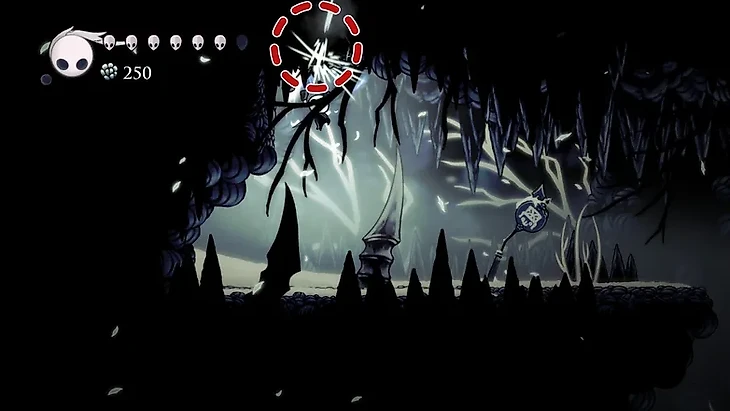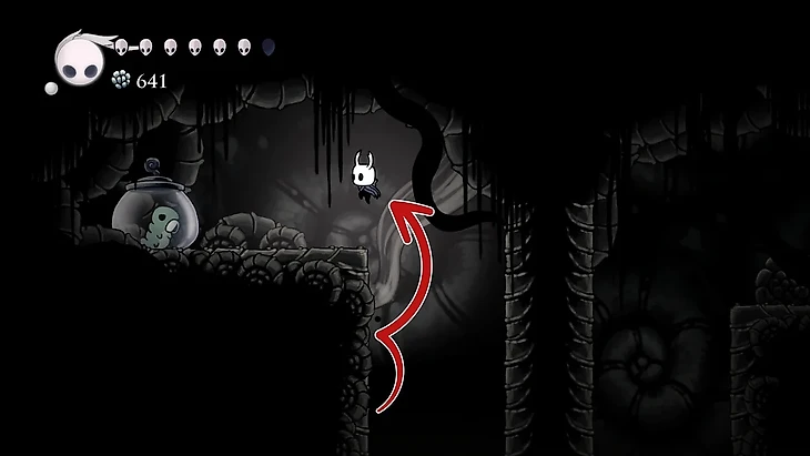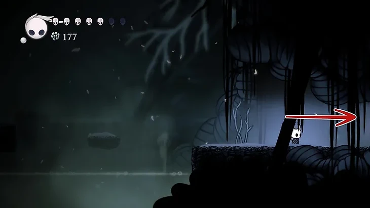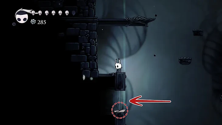 После получения Монарших крыльев отправляйтесь ко входу на Край Королевства. Следуя далее направо, вы попадете в район с двумя трещинами в полу. Используйте двойной прыжок, чтобы перебраться через них и обнаружить отверстие в потолке. Воспользуйтесь крыльями, чтобы взлететь на верхнюю платформу и достать тайник с запасами.