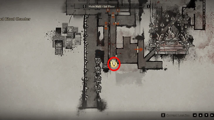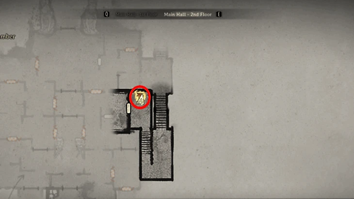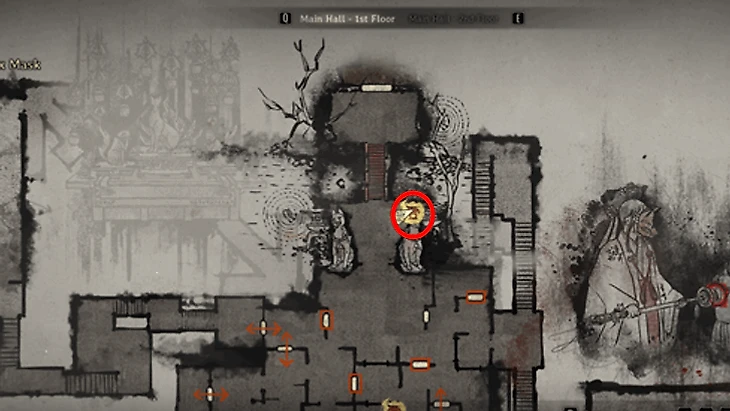 21. На втором этаже главного зала. Когда последуете за белой маской, поверните в другую сторону и поднимитесь по лестнице.