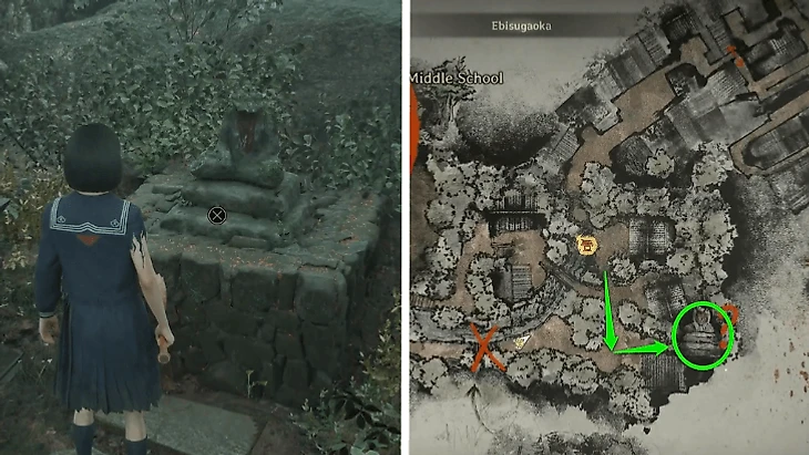 Третью статую божества можно обнаружить за школой, рядом с хижиной. Для ее активации необходимо найти сломанную японскую гэту (сандалию).