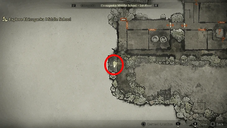 5. В средней школе Эбисугаоки табличка расположена в небольшом дворике на коробке, покрытой серой тканью, напротив стульчика без спинки.