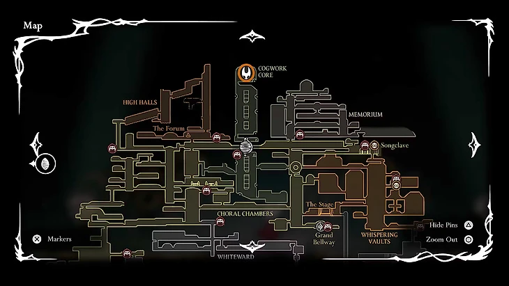 Итак, как добраться до головоломки? Поиск начинается в центральной комнате Хоровых Камер, где стартует квест по сбору мелодий. Оттуда необходимо спуститься вниз и войти в Cogwork Core. Внутри двигайтесь влево, затем вниз, пока не встретите врагов и вертикально движущуюся шестерню. Используйте прыжки и приемы с гарпуном, чтобы подняться на верхние платформы. Этот участок представляет собой полноценное испытание на реакцию и точность.