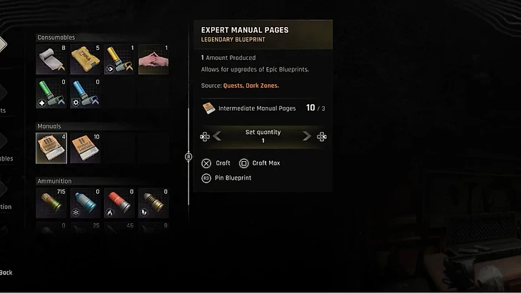 Важно: не выбрасывайте мануалы низшего уровня. Например, мануал для умельцев в Dying Light: The Beast нужен для крафта страниц более высокого качества. Чтобы создать один экспертный мануал, требуется три промежуточных.