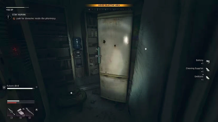 Нужный вам холодильник находится в задней комнате, и чтобы попасть туда, вам придется взломать замок на двери. К сожалению, холодильник окажется пуст. Поскольку Джейми нет рядом, Кайл сообщает плохие новости Лиаму по рации, и тот просит дождаться дальнейших указаний, после чего вы можете покинуть Аптеку.