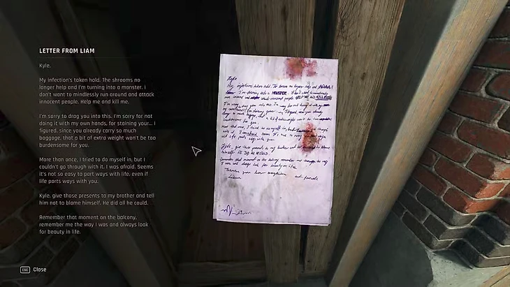 После того как вы нашли семейное фото, Лиам просит вас встретиться с ним на ферме к югу от пещеры. Пока вы едете туда, Лиам благодарит вас по рации, и Кайл начинает опасаться худшего. Добравшись до сарая на ферме, вы найдете записку снаружи, на одном из проемов, которая раскрывает горькую правду: инфекция взяла верх над Лиамом. Он не хотел, чтобы Кайл проливал его кровь, но теперь выбора нет.