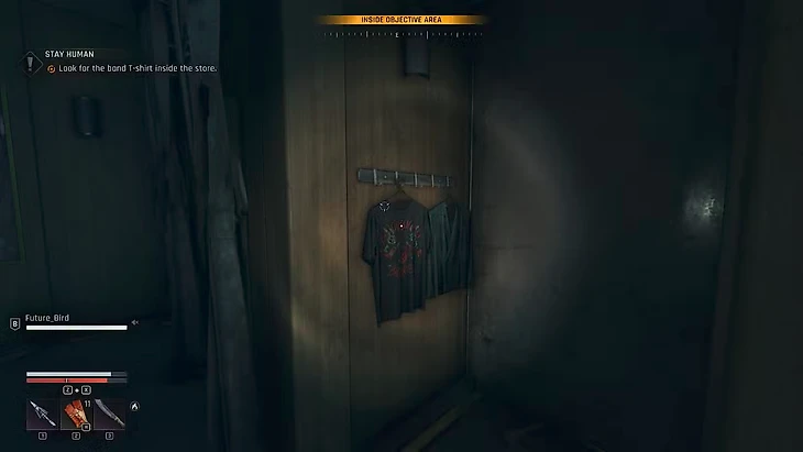 Внутри магазина вы найдете много вещей и тряпок, а сама футболка висит на вешалке в одной из примерочных, расположенной сразу справа от входа. Вы можете легко определить местоположение футболки, используя Чувство Выжившего Кайла. Забрав футболку, покиньте магазин и приготовьтесь к поиску последнего подарка.