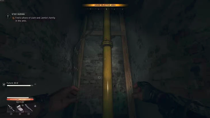 Лиам просит вас отправиться на чердак. Вернитесь к главному входу в хижину, но на этот раз пройдите через правые двери, чтобы попасть в небольшую комнату с вентиляционным отверстием внизу. Проползите через вентиляцию, и вскоре вы увидите желтую трубу, по которой можно подняться. С трубы совершите прыжок назад в еще одно вентиляционное отверстие, чтобы оказаться на чердаке.