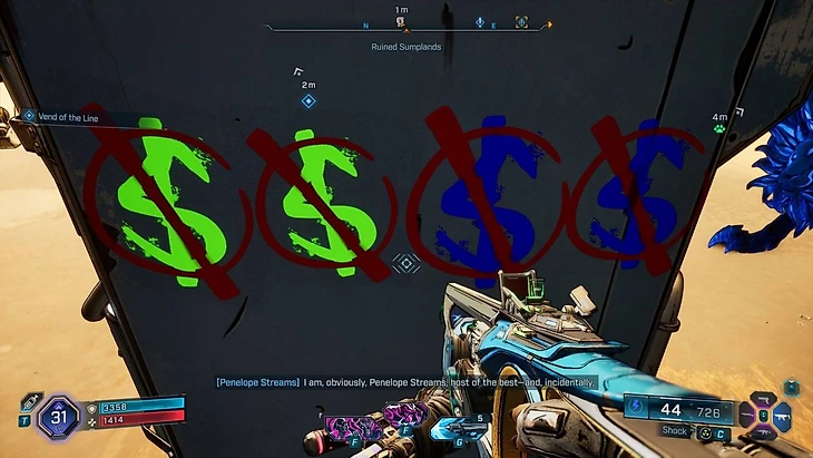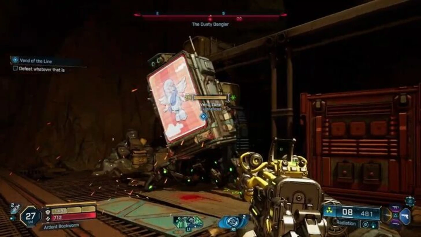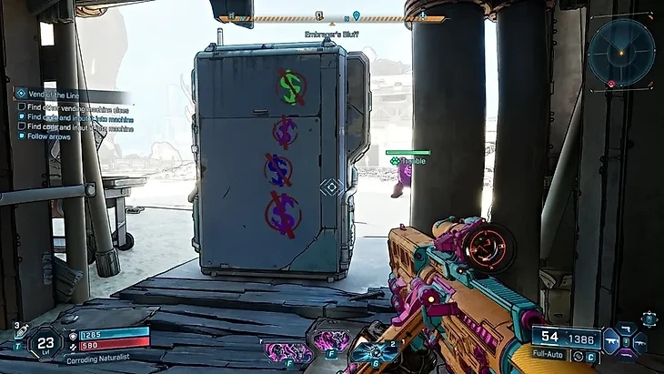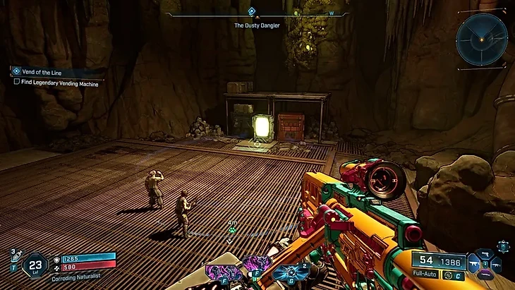 Квест начинается с разговора Пенелопы с другим NPC (Собирателем Хранилищ) около торгового автомата Guns – в разговоре Пенелопы с этим собеседником будет упомянут некий легендарный торговый автомат, который выдает очень, очень хороший лут. Дождитесь завершения беседы. Попробуйте поговорить с этим NPC, чтобы еще что-нибудь разузнать – хотя большую часть информации вы сможете получить точно не от него.