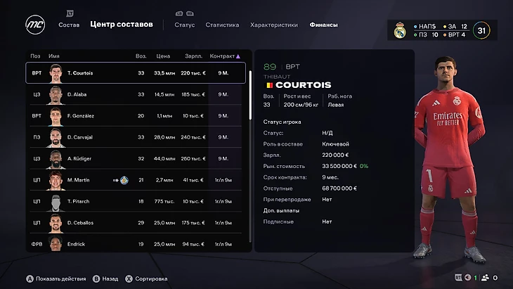 7. Следите за контрактами в карьере. Потерять топовых футболистов проще, чем вы думаете! Обязательно зайдите с «Центр составов», выберите раздел «Финансы» и отсортируйте игроков по длине соглашения (X/квадрат). Продлите или продайте игроков с годом контракта и ниже в начале сезона, иначе с января на них выйдут другие клубы и летом они уйдут бесплатно.