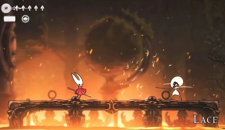 Лейс быстро атакует, поэтому надо постоянно уклоняться. Когда врубает комбо, то активируем «Быстрый шаг» и покидаем опасную область ударов. С платформы лучше не падать во время атак Лейс. По возможности наносим удары. Атакуем «Осколком Жала» и «Прямым штырем». Достаточно короткий бой, если все правильно делать.