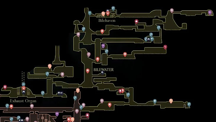 Исследуя вход, обратите внимание на указатели – они ведут к первой станции зверя, где можно сохранить прогресс. Если застряли, используйте карту Желчноводья соседних зон: Желчноводье граничит с Гнилыми Каналами (Rotten Channels), другой секретной областью, связанной порталами из ткани. В общем, доступ к локации открывает новые механики, такие как взаимодействие с вязкой желчью, которая замедляет движение, но позволяет создавать временные платформы.