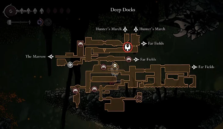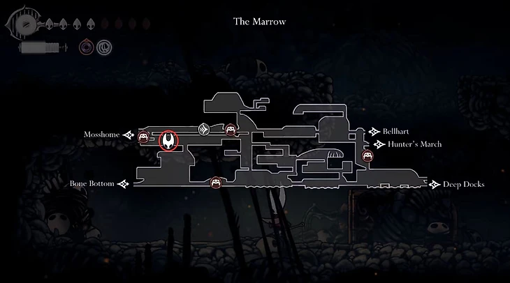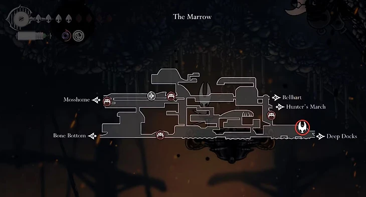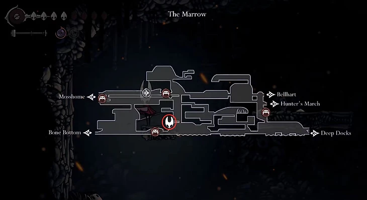 Вертикальная комната в Костяке, верхний левый угол. Идите от Зоны Марроу вправо, спуститесь на дно вертикального зала, ниже. Тело в углу – используйте платформы для подъема.