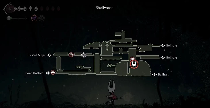 Панцирный лес (Shellwood), под платформой. Из Звонвилля идите вправо, поднимитесь на лифте, бегите влево и взбирайтесь по уступам. Тело пустоты прячется под платформой – просто спрыгните и ударьте.