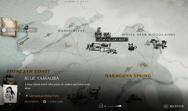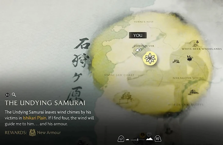 Чтобы запустить квест с Бессмертным Самураем, достигните северо-западной части равнины Исикари. Там вы найдете сожженную деревню – отправную точку задания. Подойдите к мужчине, сидящему у камня внутри деревни, и поговорите с ним. Он расскажет слух о Страннике-рассказчике (Ugetsu the Storyteller) и Бессмертном Самурае, активируя мифическую сказку «The Undying Samurai».