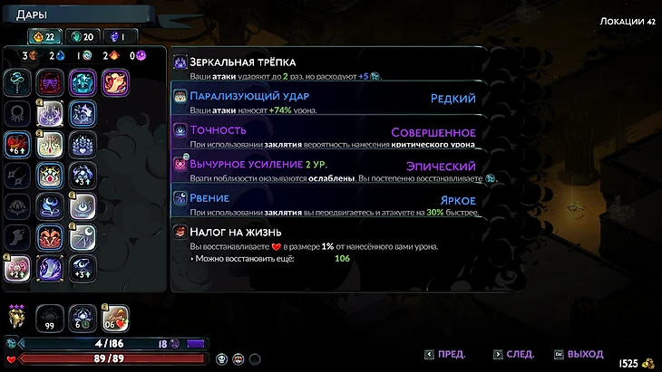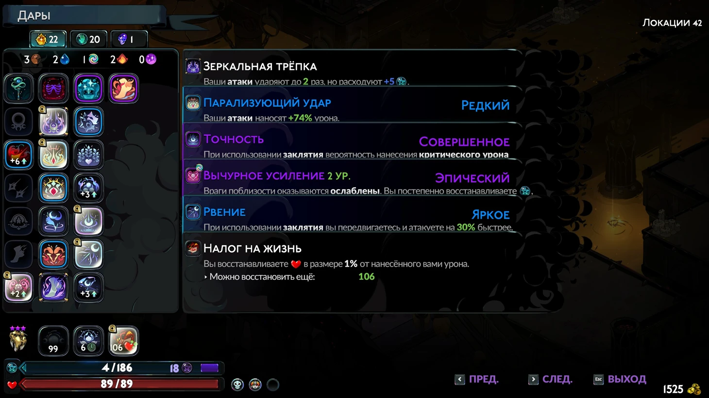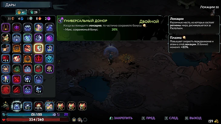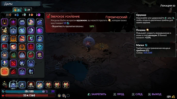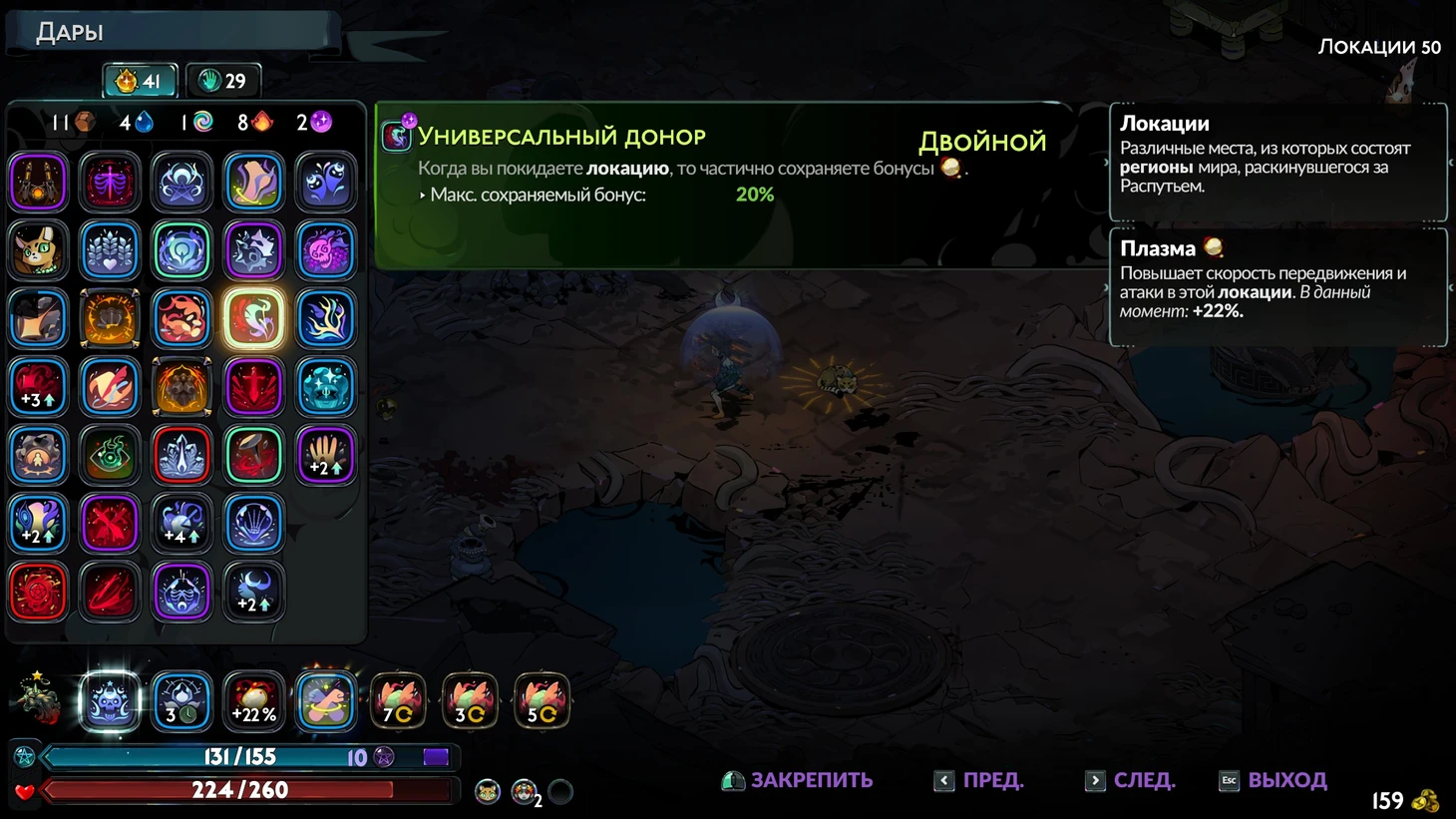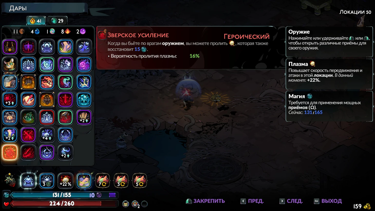 Выбор, который точно подойдёт всем билдам — Арес, а конкретно перки на выбивание плазмы. Это белые сгустки, которые повышают вашу скорость перемещения и атаки на время битвы. Легендарный дар Ареса позволяет собирать их автоматически, а совместный дар с Герой — сохранять между битвами. Таким образом, перед выходом на босса вы можете копить 30% и более к скорости перемещения и атаки. Также при нужных перках подбор плазмы будет восстанавливать вам ману, что полезно в связке с использованием маги и особых риёмов при зажатии клавиши атаки.