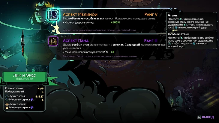 У оружия может быть несколько режимов атаки. Например, серп и нож бьют быстро на основную и кидают относительно медленный нож на дополнительную. Поэтому имеет смысл взять накапливаемый бонус на основную атаку, а бронепробитие или тот же большой урон Гефеста — на дополнительный бросок ножа.