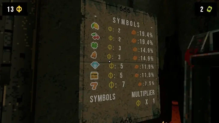 Игрок заперт в комнате, и его основная цель – получить ключ для выхода из комнаты. Основные элементы: слот-машина с рычагом, баннеры с процентами и очками, стенд с артефактами для пассивных эффектов, телефон и банкомат.