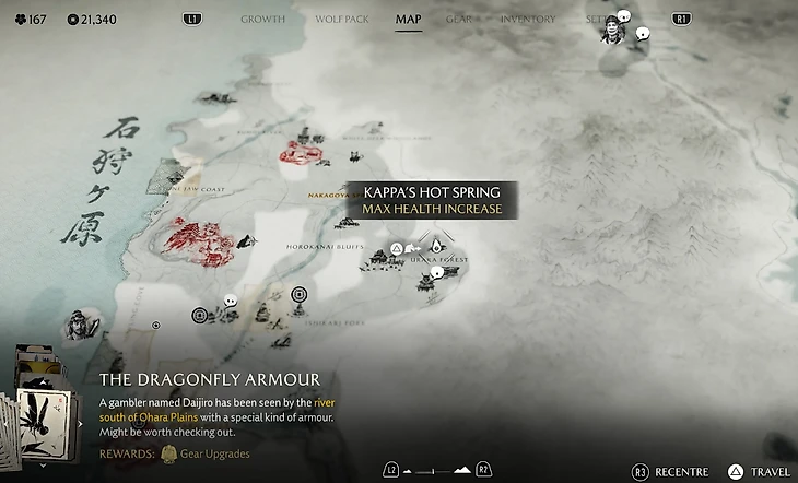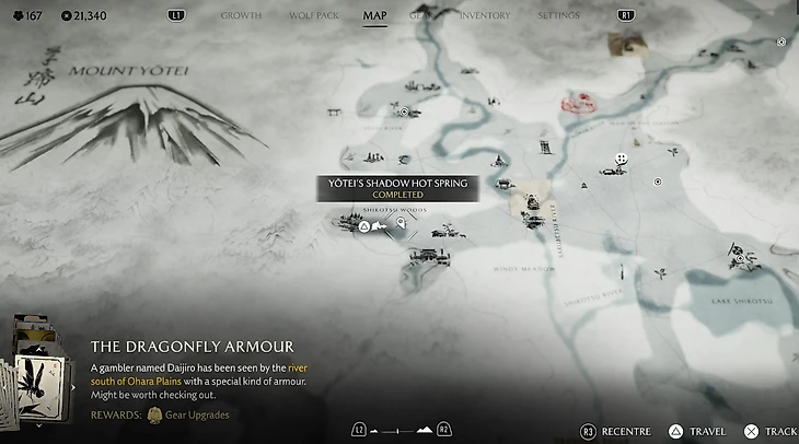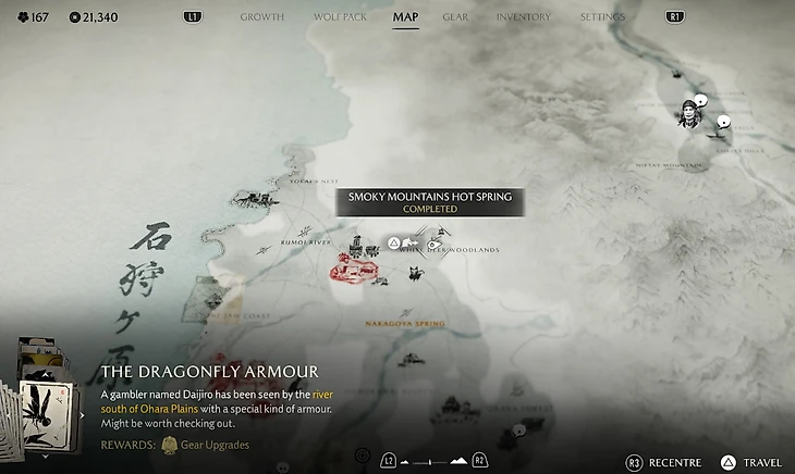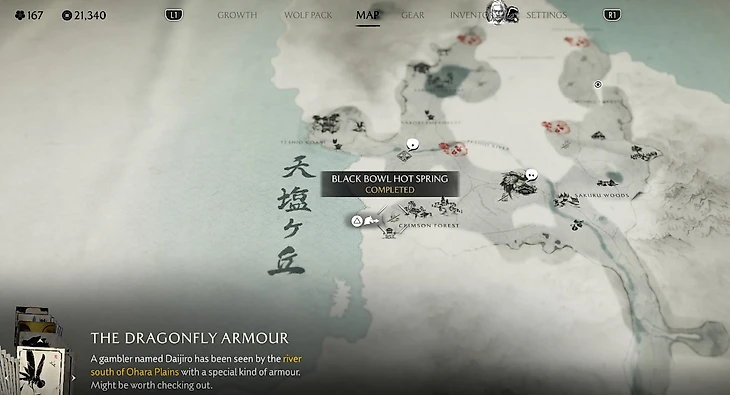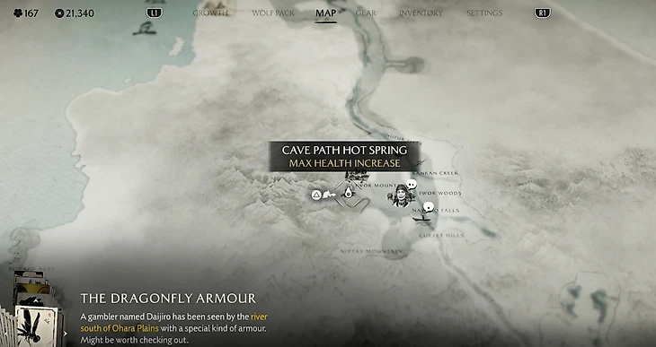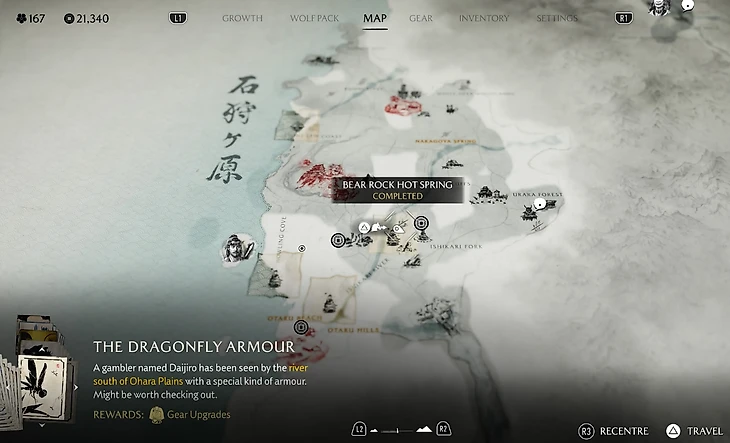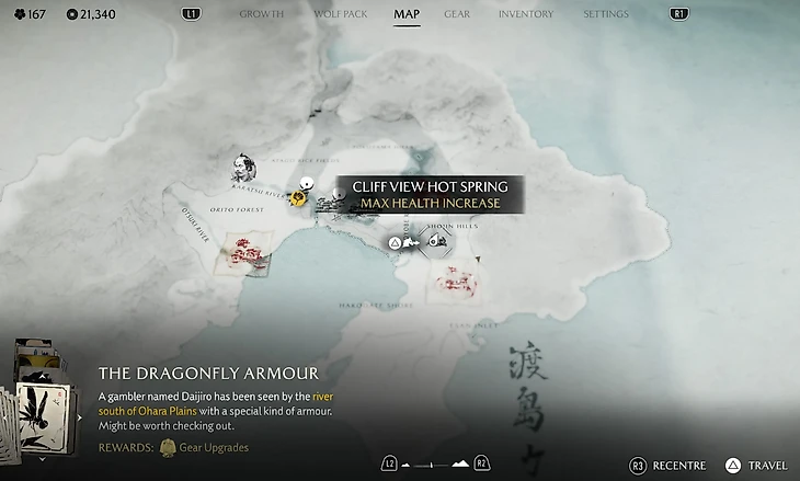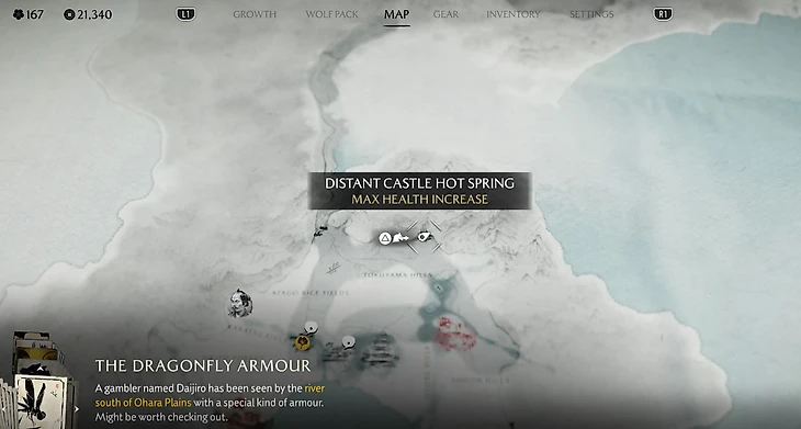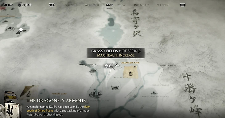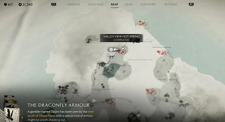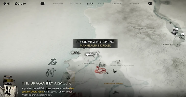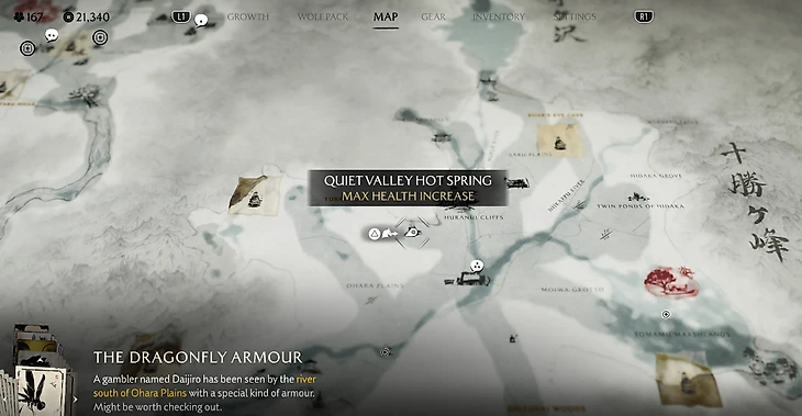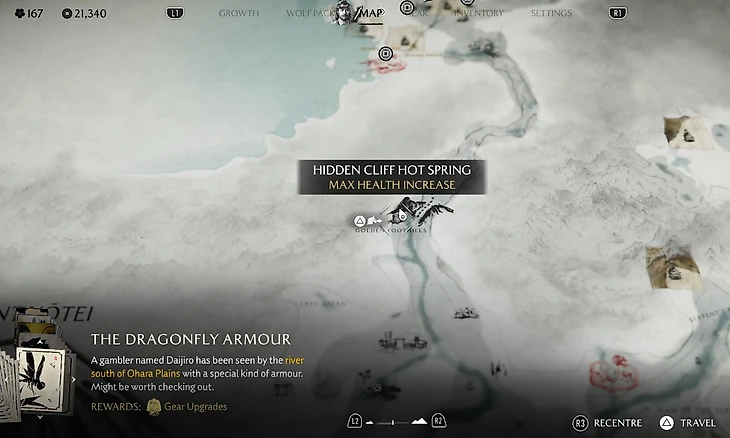 В дальневосточных краях, неподалеку от старинного замка «Мацумаэ», среди живописных холмов «Седзин», где первая буква в названии намекает на предстоящее приключение, вас ждет гора, достойная восхождения. Отыщите слева от разрушенного моста участок, который подойдет для лазания, – там же вы сможете закрепить крюк. Подъем вознаградит потрясающим видом с утеса и возможностью расслабиться в горячей воде, завершая серию открытий.